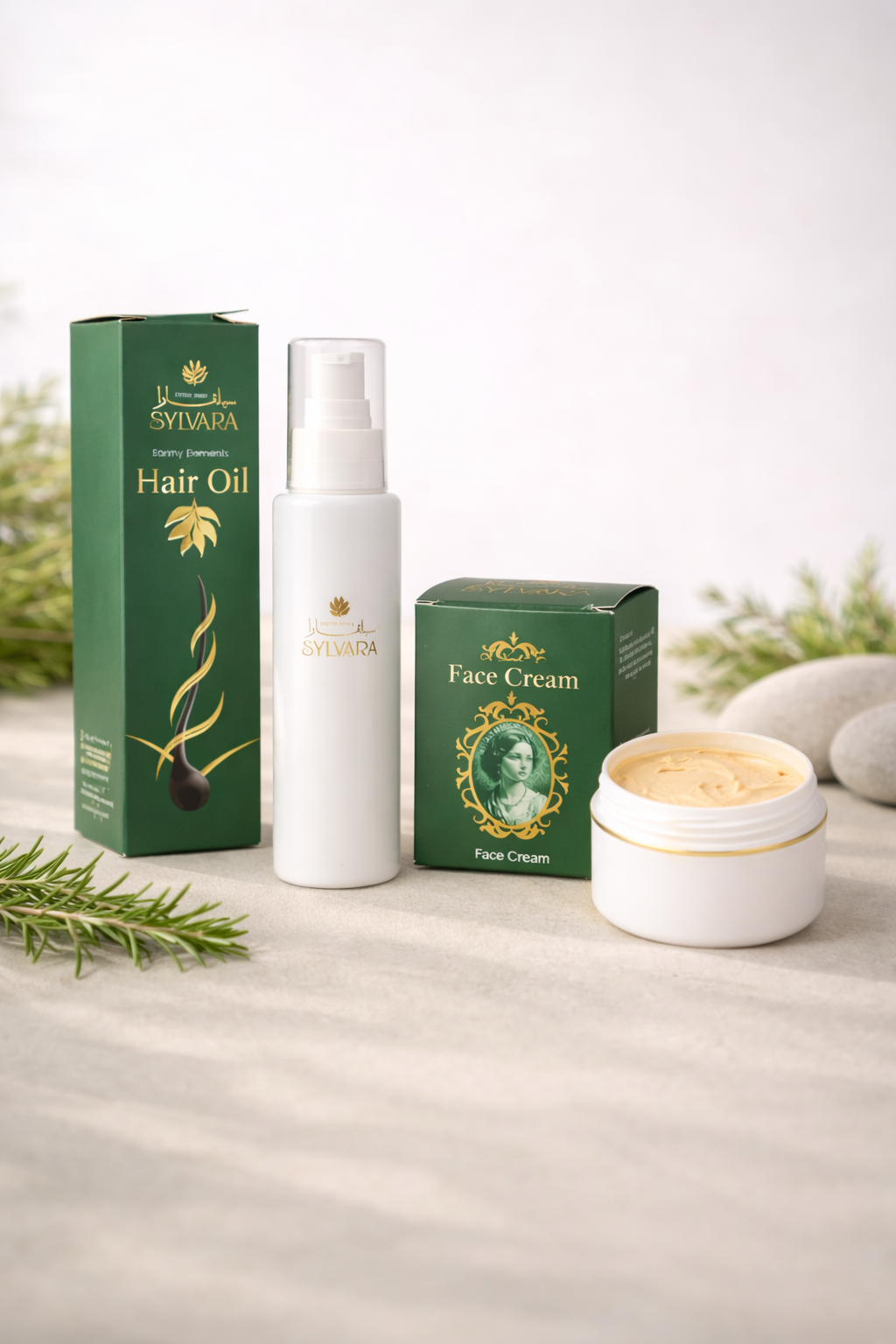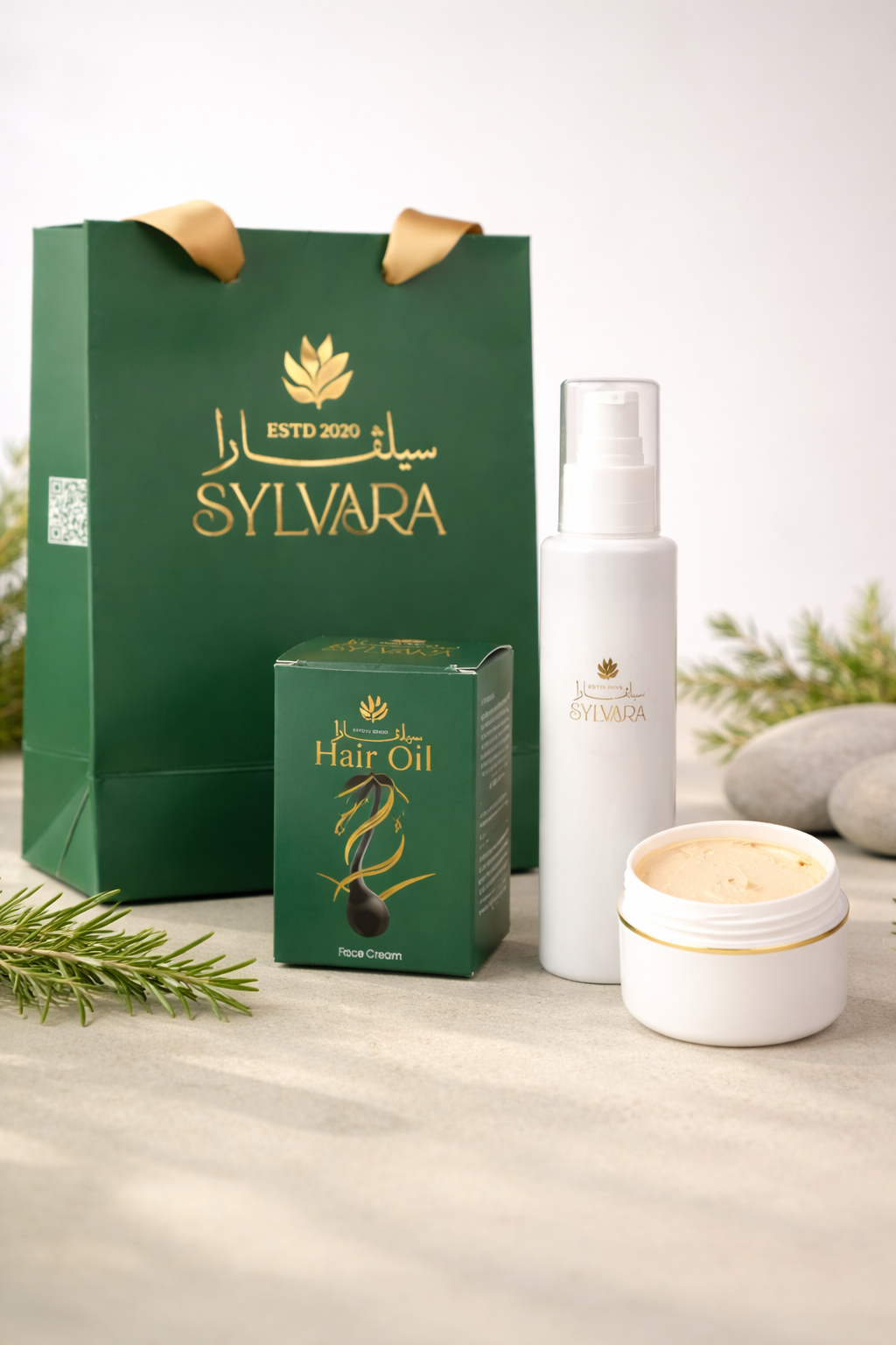 A nourishing duo combining Sylvara Hair Oil and Face Cream to care for both hair and skin, leaving them soft, hydrated, and radiant.